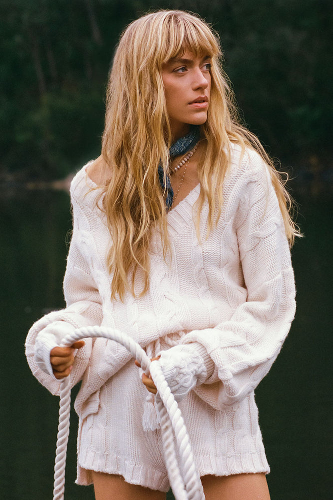 The Cosy Campfire Jumper in Vintage Cream wraps you in warmth and charm with its cable knit texture and playful side hem splits. Crafted from a soft blend of wool and organic cotton, this V-neck jumper features dropped shoulders for a relaxed, effortlessly cool vibe. Perfect for chilly nights by the fire or casual days out, it’s your new go-to for cosy style. Pair with the Cosy Campfire Knit Shorts or Cabin Lounge Pant for the ultimate off duty look.
