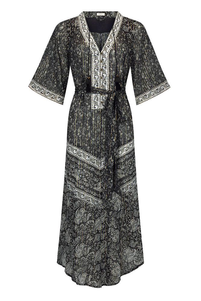 Featuring elbow-length sleeves, a waist tie for a flattering fit, and delicate neck ties with tassel-trimmed ends, this maxi is all about the finer touches. The center-front placket opening enhances its versatility, making it perfect for a daytime soiree or an evening under the stars.