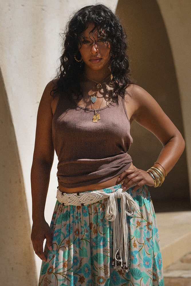 The With The Band Singlet in Cocoa is the perfect blend of comfort and cool. Made from 100% organic cotton, the variegated rib fabric creates a unique texture that feels as good as it looks. The self-fabric bind at the neck and armholes adds a touch of refinement to this laid-back piece. Whether you’re pairing it with jeans, shorts, or a flowy skirt, this singlet is a versatile staple for your wardrobe. Wear it your way and let the effortless style shine through.