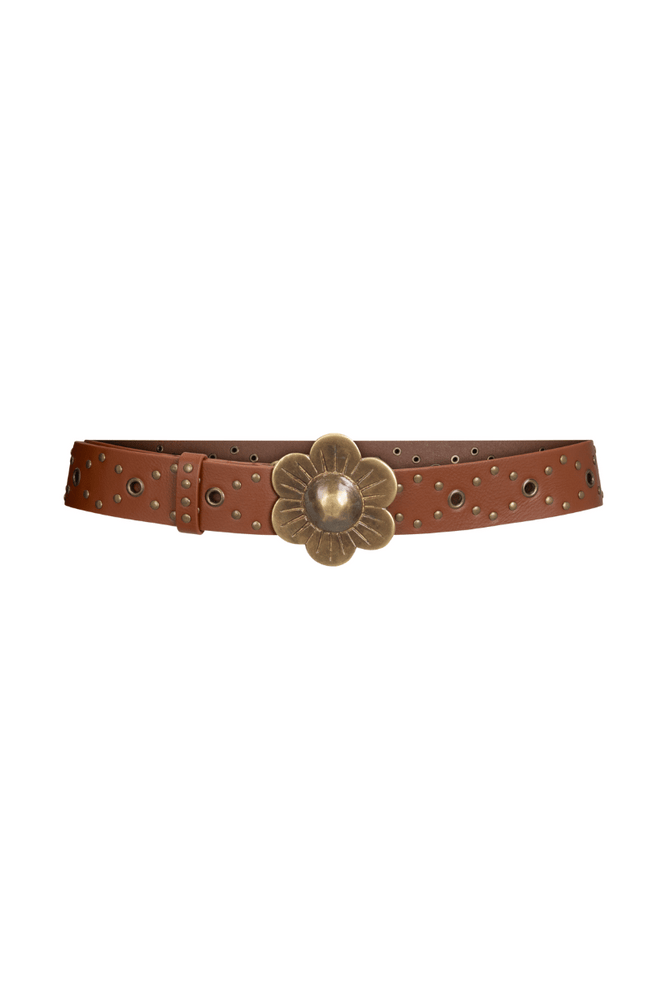 <p>Leather Belt</p><p>Custom Antique Brass Daisy Buckle<br>Stud detail on belt<br>Antique Brass eyelets</p>